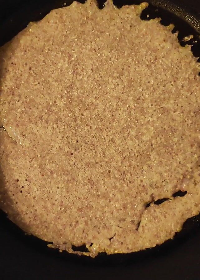 A close-up shot shows a light-brown, pancake-like item cooking in a black cast-iron skillet. The edges are slightly ragged and there are cracks in the surface. There's oil visible around the edges. The lighting is somewhat dim. The skillet rests on a wooden surface.