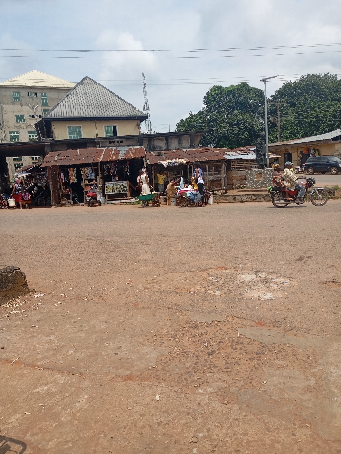 This image captures a daytime street scene in Neni, Nigeria, depicting a market area and road activity