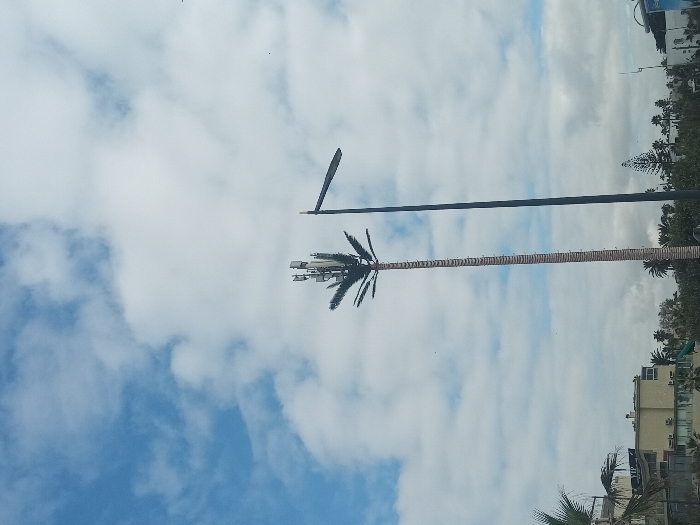The image depicts an urban outdoor scene in Casablanca, Morocco, under a partially cloudy sky. In the foreground, a tall, slender cellular tower disguised as a palm tree stands prominently, featuring a textured brown trunk and artificial green fronds at its apex, beneath which communication antennas are visible. To its immediate right, a dark grey street light pole extends vertically, topped by a horizontal arm supporting a single, dark-colored light fixture. In the midground to the left, a multi-story, light-colored building with balconies and visible air conditioning units is partially obscured by the fronds of natural palm trees. To the right of the street light, a dense collection of various palm trees and other greenery marks the landscape. No people or specific actions are discernible in the scene.