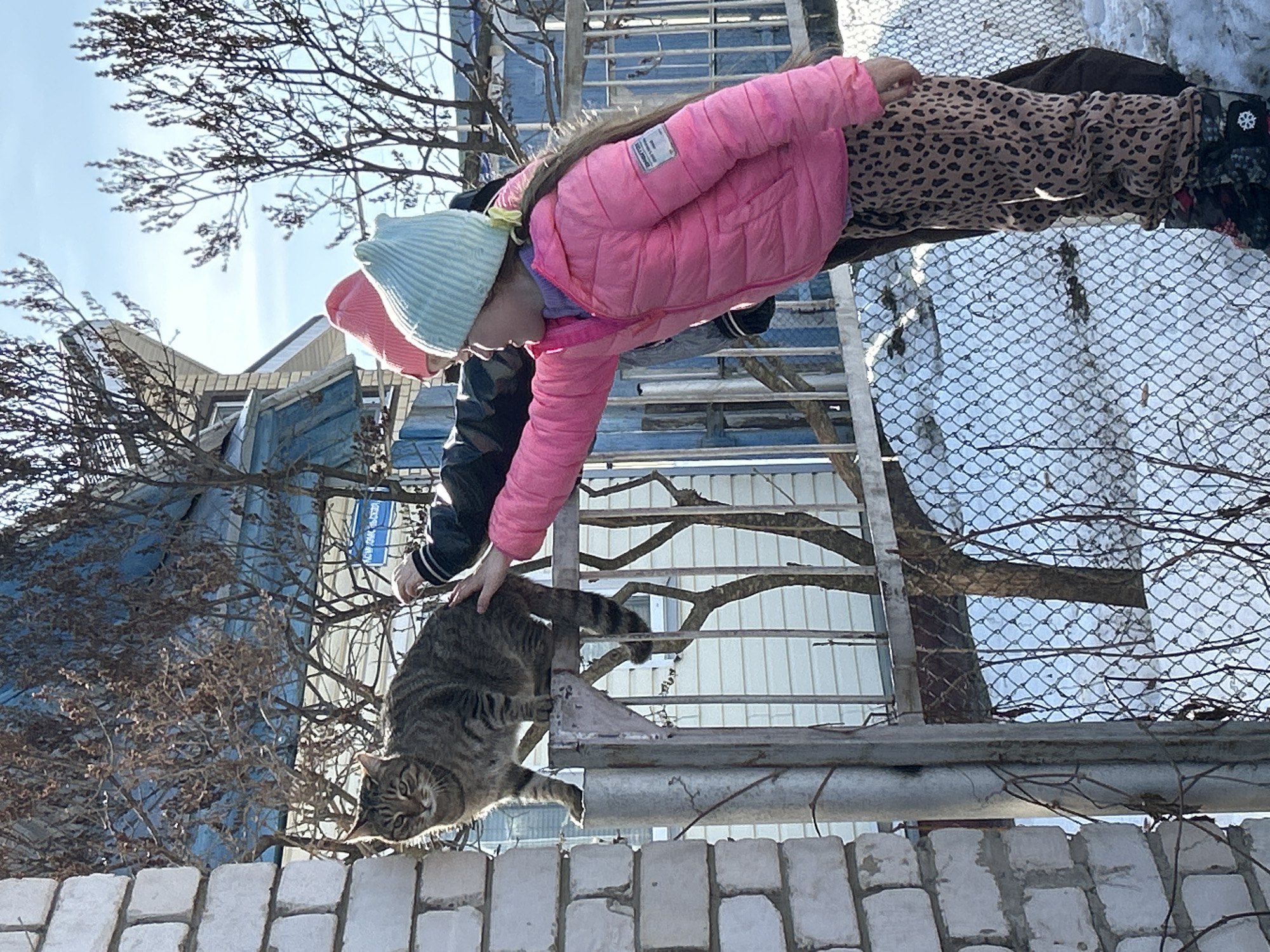 A young girl in a pink puffer jacket, a blue knit hat, and animal-print pants is reaching out towards a tabby cat sitting on top of a white brick wall. The girl is leaning over a metal ladder that is positioned in front of a blue wooden building. A fence is also visible in the background, along with bare tree branches. The location is Chaikovsky, Russia.
