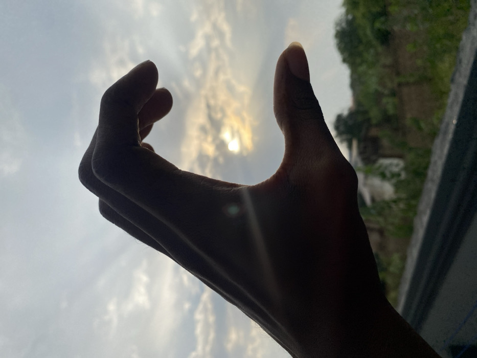 Against a bright, sun-streaked sky with scattered clouds, a dark hand is positioned as if to hold the sun. The thumb and forefinger form a partial circle, framing the bright, hazy sunlight. A lens flare emanates from the hand. In the background, blurred green foliage and a building are visible on the right side, suggesting an outdoor setting. A hint of a wall or railing is seen on the lower right.