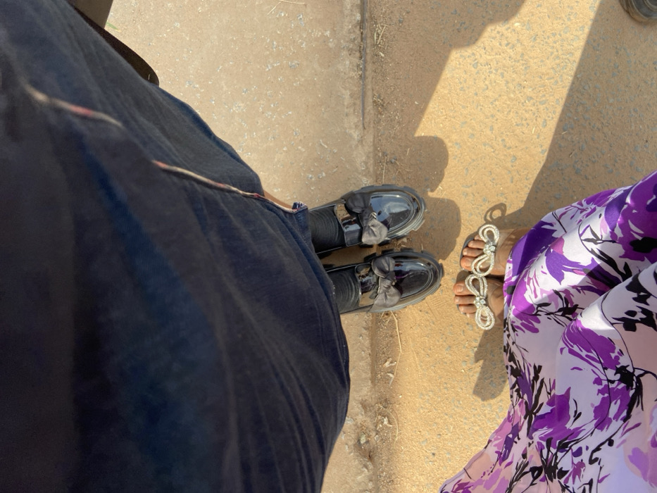 This image presents a top-down view of the lower torsos, legs, and feet of two individuals standing on a light brown paved surface in Oba, Nigeria