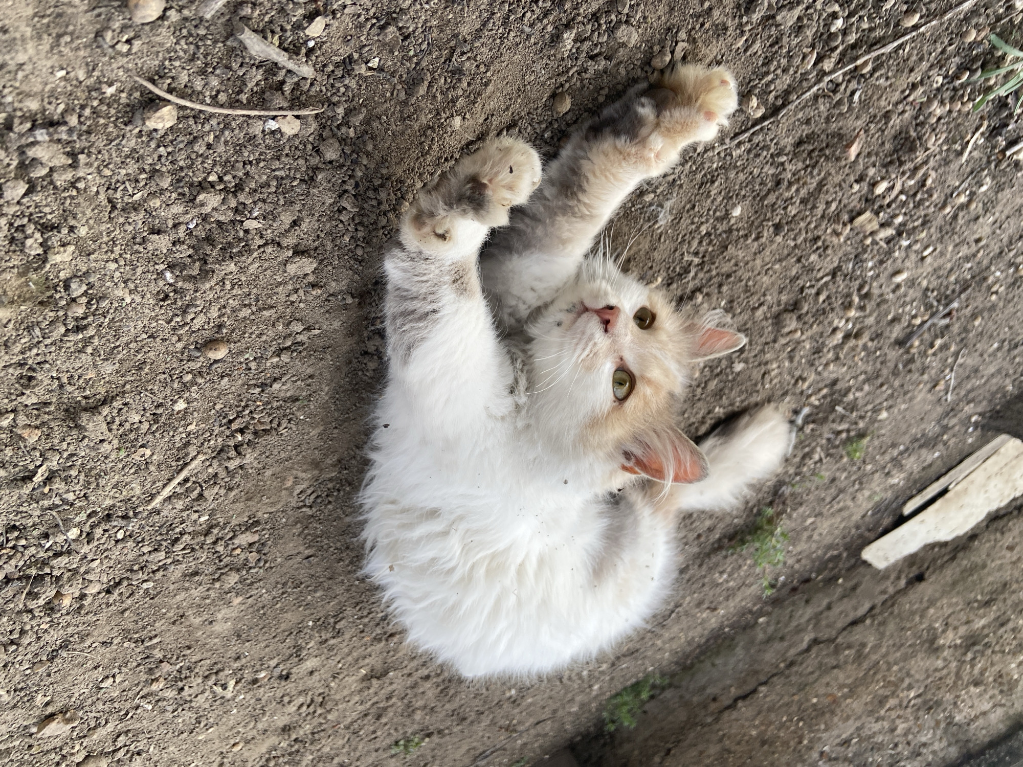 In Gulyantsi, Bulgaria, a domestic cat (Felis catus) is observed lying on its dorsal side on a surface composed of loose, dry brown soil mixed with small stones and gravel. The animal possesses long fur, predominantly white on the torso and hindquarters, with cream-to-light-orange markings on its head, ears, and forelegs. Its eyes are light green with vertical pupils. The cat's front paws and lower forelegs are visibly soiled with dark brown dirt, and its claws are partially extended. Its head is tilted, and it is looking directly towards the observer. Sparse green vegetation is present in the soil. A segment of a textured concrete or stone wall is visible in the upper left background. No other individuals or significant objects are present.