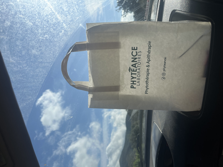 A light-colored paper bag, bearing the text "PHYTEANCE LABORATOIRES" and "Phytothérapie & Apithérapie," along with social media handles "phyteance," is centrally positioned on the dashboard of a vehicle