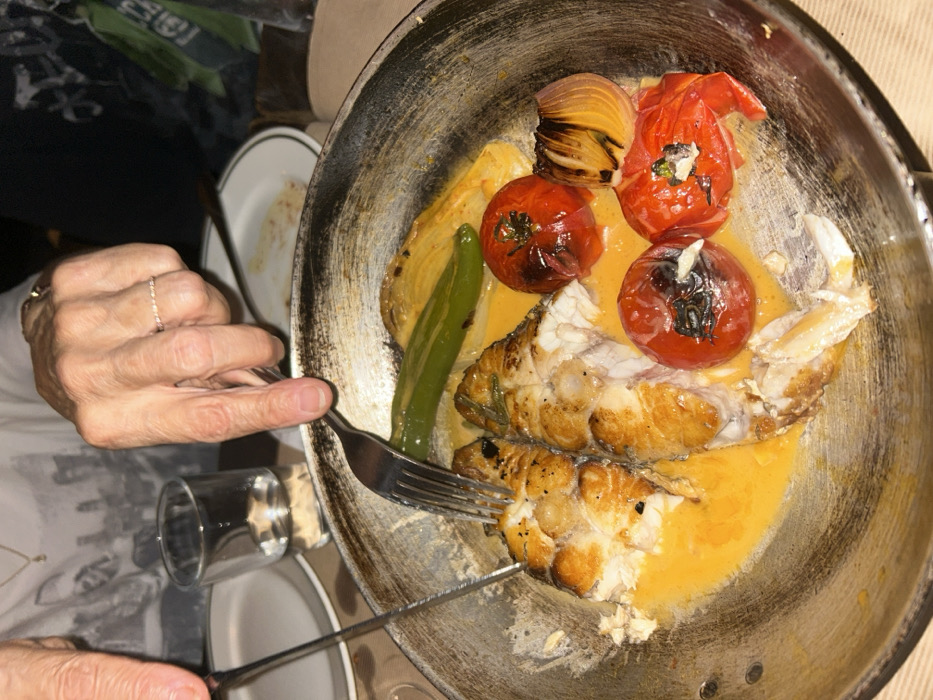 The scene captures an overhead view of a dining table at Claro Restaurant, located at Ha'arba'a St 19, Tel Aviv, Israel. The central focus is a large, dark metal skillet containing a portion of a meal. Inside the skillet are two cuts of cooked fish, exhibiting a browned exterior and white flaky interior, resting in a bright orange-yellow sauce. Accompanying the fish are two whole roasted red tomatoes, one roasted onion half, and one green chili pepper. A person's hands are actively interacting with the food. The left hand holds a silver knife positioned over the skillet, while the right hand, featuring a thin ring on the ring finger, uses a silver fork to pierce one of the fish pieces. A clear glass tumbler filled with water is visible on the left side of the table. Two white plates, one partially visible on the left and another mostly cleared on the right, are also present. The environment is dimly lit, suggesting an indoor evening setting.
