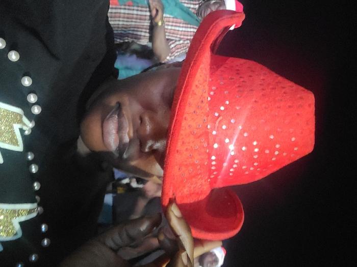 A person is seen from the shoulders up, slightly sideways and looking at the camera. They are wearing a black shirt with pearl-like buttons and gold lightning bolt designs. On their head is a large, red hat with shiny, round decorations. The background is dark. Other people are partially visible behind the main subject.