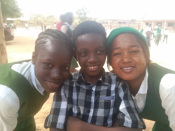 The image depicts an outdoor school environment in Jos, Nigeria, under bright daylight conditions. In the foreground, three young individuals of African descent are smiling directly at the camera. On the left, a female with short braided hair wears a white long-sleeved shirt under a dark green sleeveless jumper. In the center, a male with short dark hair wears a black and white plaid long-sleeved shirt with a small logo and has his arms crossed. On the right, a female with visible facial freckles wears a green beanie, a white long-sleeved shirt, and a dark green sleeveless jumper. The three individuals are positioned closely together, suggesting a positive interaction. The background features a dusty, unpaved schoolyard where numerous other individuals, primarily students wearing similar white shirts and dark green uniforms, are visible. A dark-colored vehicle is partially present on the far left. Single-story buildings, consistent with school architecture, are visible in the distance. No specific geographic landmarks within Jos are discernible in the image.