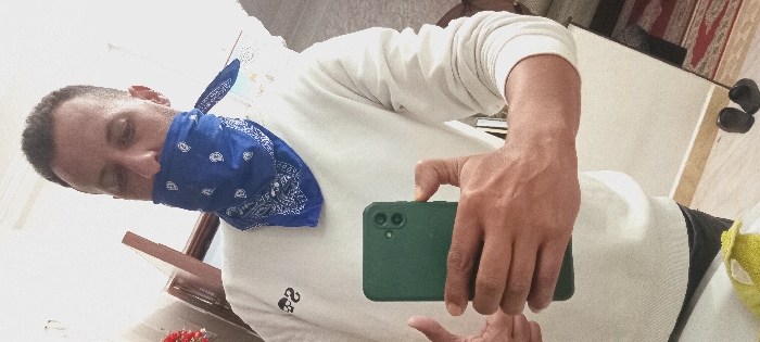 - "A man takes a selfie, wearing a white long-sleeved shirt with a logo and a blue paisley bandana covering his nose and mouth" by FM-MM3Sy2, licensed under CC BY 4.0