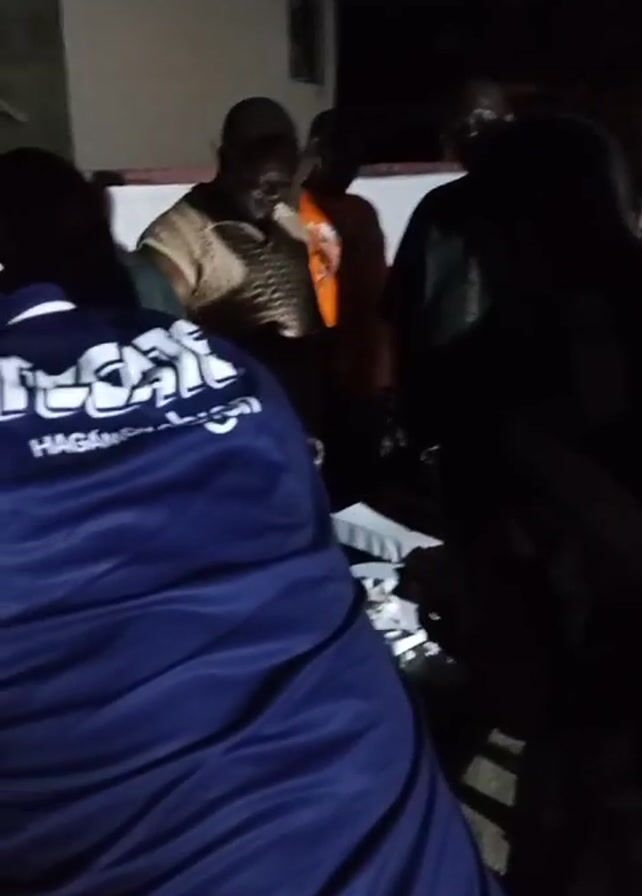 A group of about five men are gathered outside a building at night. The men are of African descent. One man is wearing a blue jacket with white writing on the back. Several of the other men are wearing sweaters or jackets. The scene is dark and the video is somewhat blurry.