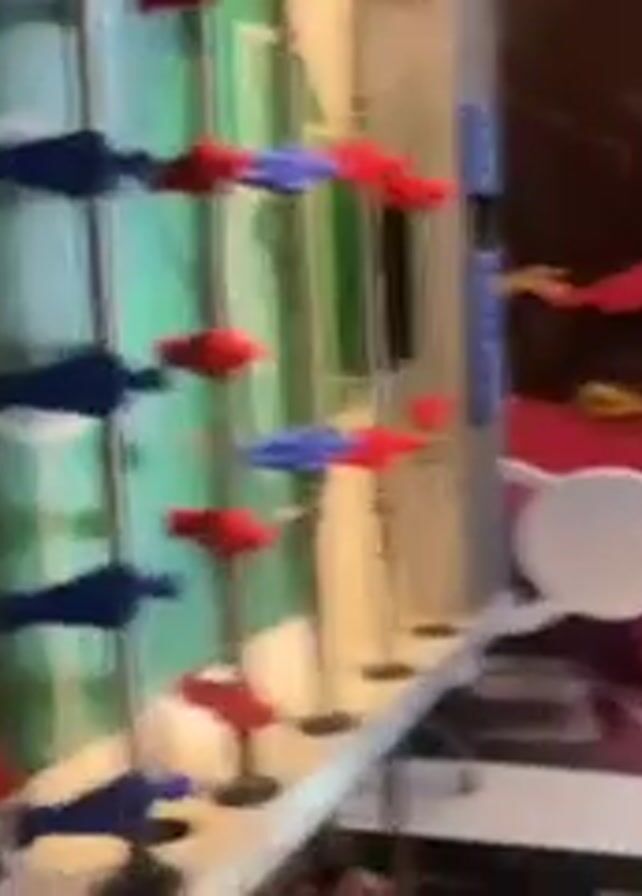 close-up of a foosball table with blue and red players. The ball is in play, moving quickly across the green field. The camera is close to the table, offering a view of the rods, players, and the motion of the ball. There's a partial view of a colorful poster or artwork in the background.