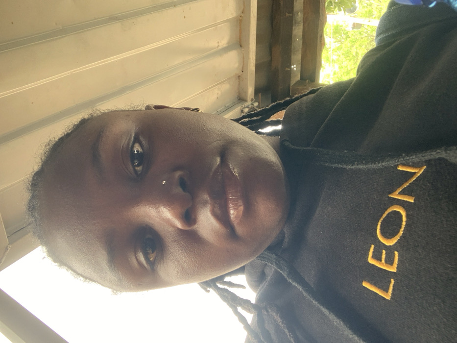 An individual is depicted in a close-up, upward-angled portrait, positioned in Arawa, Nigeria. The person, with dark skin and dark braided hair, faces directly towards the viewer. A small, spherical metallic piercing is visible on the left nostril. The subject wears a black hooded sweatshirt featuring "LEON" embroidered in yellow capital letters on the front. A reflective sheen is present on the lips. The upper left background is an overexposed white area, while the upper right features a light-colored corrugated panel structure. Below this structure, wooden architectural elements are visible, with glimpses of green foliage in the distant background, indicating an outdoor or semi-open setting.