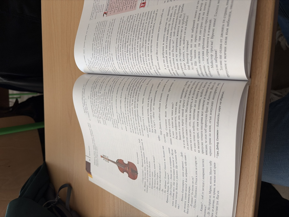 The image captures an open textbook in Bulgarian Cyrillic script, resting on a light-colored wooden desk. On the left page, a detailed illustration of a multi-stringed instrument, possibly a viola da gamba, is depicted. Both pages are filled with text, including narrative and dialogue. In the blurred background, a green chair back and dark fabric are partially visible, suggesting an indoor educational environment. A dark bag strap is also visible on the desk in the upper left corner. The perspective is a first-person view, looking down at the book. The lower thighs and knees of an individual, clad in dark trousers, are discernible beneath the desk in the bottom center of the frame. No specific landmarks or architectural features are present to identify the precise location within Ruse, Bulgaria. The scene depicts an implied act of reading or studying.