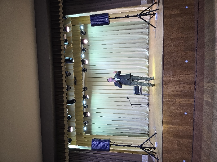An elevated stage is depicted within an indoor venue located in Мядзельскі сельскі Савет, Belarus. A single adult male stands centrally on the wooden stage floor. He wears a dark patterned suit with a white shirt and a dark bow tie. He holds a black microphone to his mouth with his left hand while gesturing with his raised right hand. To his left, a black PA speaker rests on a tripod stand, and a similar setup is present to his right. A black microphone stand is positioned behind the performer's left, and a small black amplifier is visible behind him. The background consists of light beige vertically pleated curtains, topped by a dark brown decorative valence. Two rows of stage lights are mounted above, illuminating the scene with white and amber light. The foreground shows a darker wooden floor with a black cable running horizontally across it. No other individuals are present.