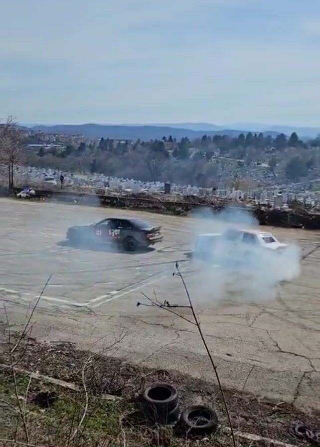 two cars engaged in drifting maneuvers on a paved surface, likely a parking lot or racetrack. The cars are a dark-colored vehicle with "ax eyer" written on the side and a white BMW M3. Both cars are kicking up a significant amount of smoke from their tires. The scene is shot from a higher vantage point, looking down upon the action. The background features a landscape with trees, buildings, and a cemetery visible in the distance. The weather appears to be sunny, and there are a few people visible watching the drifting cars. In the foreground, there is a collection of used tires and dry vegetation.