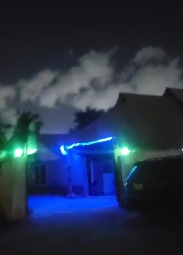 nighttime scene of a building with color-changing lights illuminating the front facade. The colors transition between green, red, and blue. A dark-colored car is parked in front of the building. There are trees and clouds visible in the background. The overall setting appears to be residential.