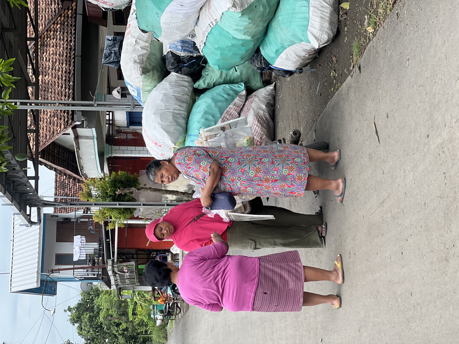 The image displays a roadside scene in Wedarijaksa, Indonesia, under an overcast sky. Three adult females occupy the paved road section. The woman on the left, viewed from behind, wears a pink short-sleeved top and a striped skirt; she stands facing the central woman. The central woman wears a pink hijab, a bright pink long-sleeved top, olive-green cargo pants, and carries a dark shoulder bag. Her right hand is extended towards the left woman. The woman on the right, wearing a multi-colored floral dress, looks towards the camera while holding a small blue handbag and a clear plastic bag containing items. She stands adjacent to a dark, two-wheeled vehicle part. To the immediate right, a substantial stack of large sacks, predominantly white, green, and black, rests on unpaved ground. The background on the left reveals a narrow paved road curving into the distance, lined with green foliage. A two-story building featuring a light blue lower section, white upper section, a metal roof, and laundry hanging on a balcony is visible. Further along the road, a person on a motorcycle is partially visible. Additional buildings with orange tiled roofs are present in the background. An overhead metal structure partially spans the scene in the upper right, from which a single green mango hangs.