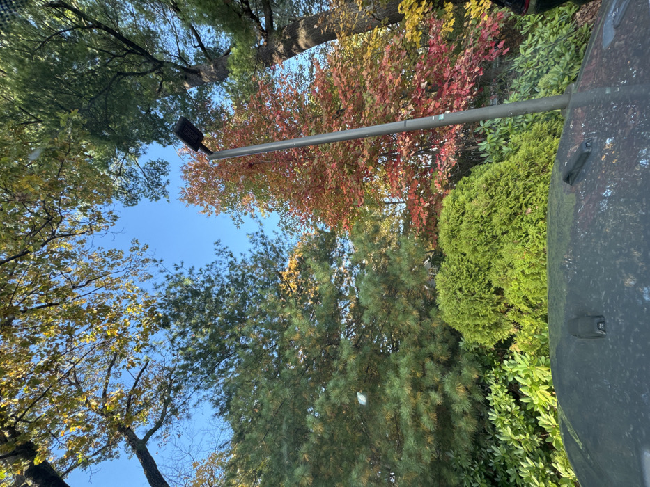 The image displays an upward-angled view of an outdoor scene in Wellesley, United States, characterized by autumn foliage. A clear blue sky is visible between the tree branches. Dominating the upper and mid-ground are numerous trees, including deciduous varieties exhibiting vibrant red, orange, and golden-yellow leaves indicative of the fall season, interspersed with evergreen trees displaying dark green needles. A tall, slender, dark grey street light pole, topped with a modern rectangular LED light fixture, extends vertically on the right side of the frame, partially obscured by the colorful tree canopy. The bottom foreground of the image consists of the dark, possibly soiled, hood of a vehicle, identifiable by two dark, rectangular hood latches or vents. Below the trees, dense green shrubs and bushes are visible, with a prominent bright green, rounded shrub in the center. No individuals or discernible actions are present.