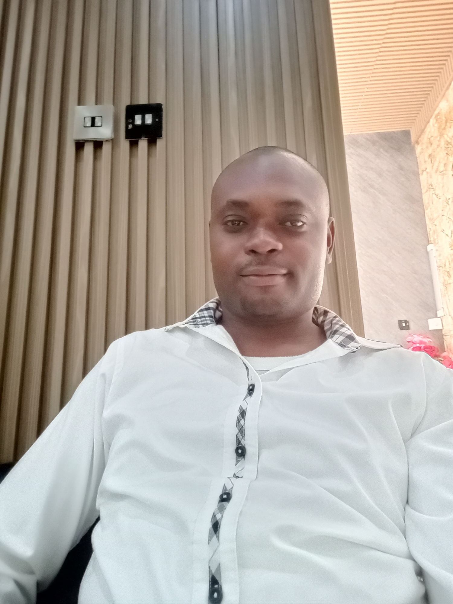 A medium shot captures a dark-skinned man with a shaved head and a neutral expression, wearing a white button-down shirt with black and white checkered detailing on the collar and button placket. He appears to be seated. Behind the man is a wall with vertical wood paneling and two electrical outlets - one white and one black - mounted on the wall. To the right of the man, there is a view of a ceiling with horizontal wood paneling, along with a section of a marble-like wall, and a hint of pink floral decoration. The location is identified as Gwarinpa, Nigeria.