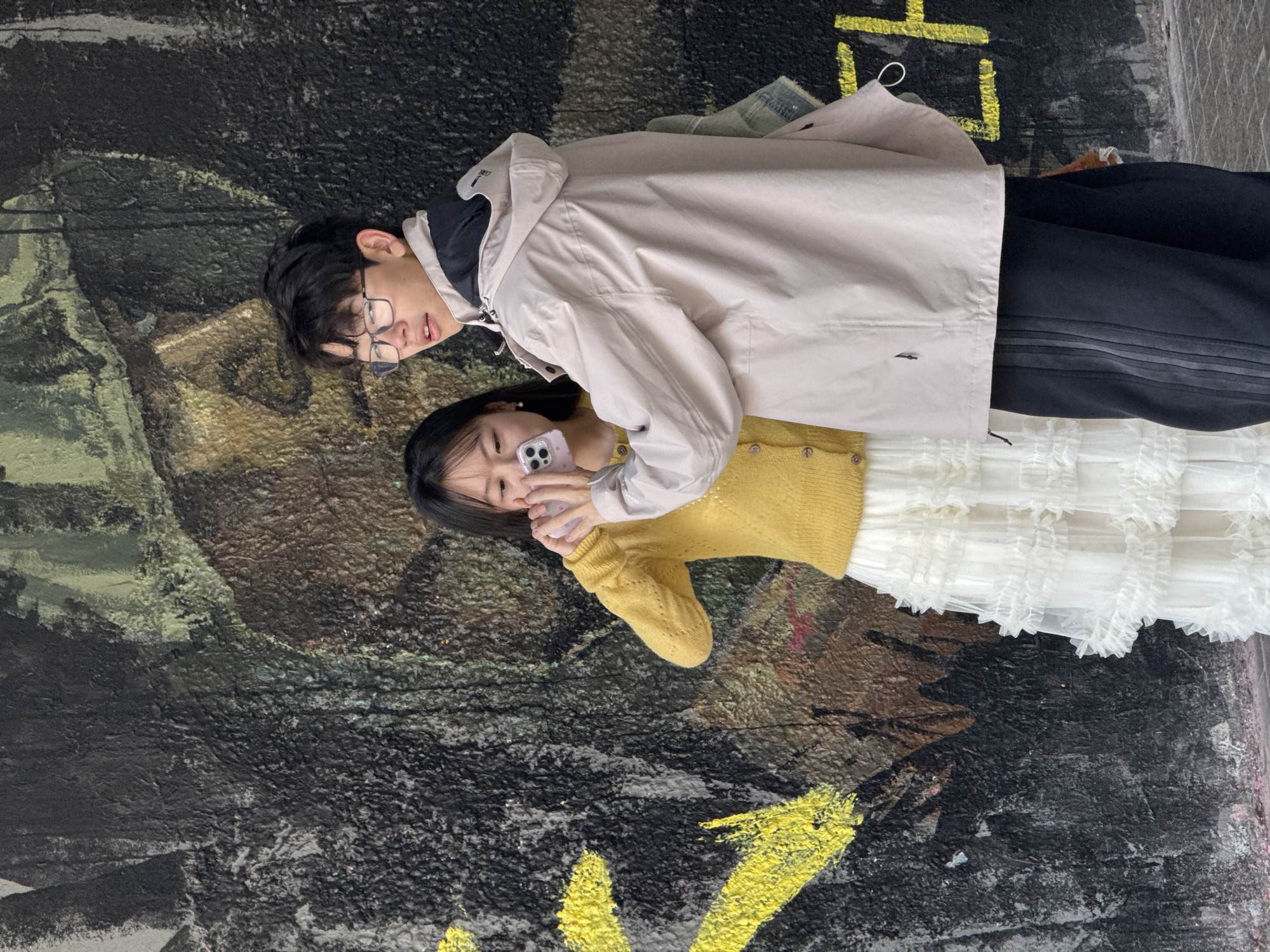 Two East Asian individuals, a female and a male, are depicted standing against a heavily textured, graffiti-covered wall in Jiulongpo District, China. The wall features abstract black, grey, and brown paint, interspersed with prominent yellow spray paint splashes and partial yellow text. The female, positioned on the left, wears a yellow knitted cardigan and a white, ruffled, layered skirt. She holds a light pink mobile phone horizontally with both hands, directing her gaze towards its screen, appearing to capture an image or video. The male, on the right, wears a light beige hooded jacket with a dark collar, black-framed eyeglasses, and dark athletic pants with vertical stripes. He is looking over his left shoulder, directly towards the viewer, with his right hand positioned near the female's hands on the phone.