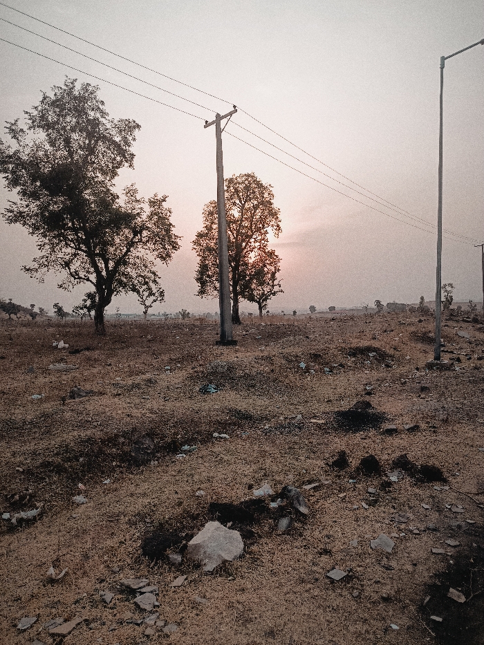 This image depicts a desolate, open area in Rafin Pa, Nigeria, under a hazy sky at what appears to be either sunrise or sunset, indicated by a faint orange glow on the horizon line. The foreground consists of dry, reddish-brown earth sparsely covered with withered grass and small, scattered rocks and debris, including visible pieces of plastic and other refuse. In the mid-ground, a dark wooden utility pole with multiple overhead wires stretches across the frame from left to right. To its left, a cluster of two dark-leafed deciduous trees stands, their canopies silhouetted against the sky. To the right of the wooden pole, another similar deciduous tree is visible, with the sun's glow partially obscured behind its branches. Further to the right, a tall, slender metal street light pole extends vertically, topped with a single lamp fixture directed towards the ground. Another utility pole is partially visible on the far right. The background shows a distant, undulating landscape with more sparse trees and undefined structures under the continuous hazy sky. There are no individuals, vehicles, or specific activities observable in the scene. The overall environment suggests an undeveloped or neglected plot of land.