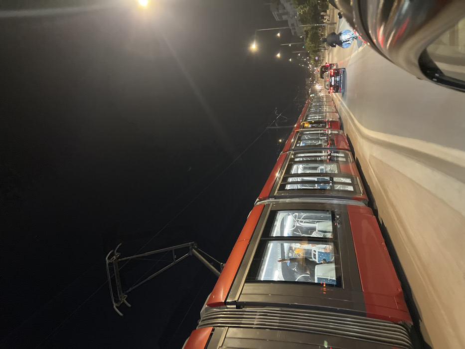 The image depicts a nighttime urban street scene in Casablanca, Morocco, captured from the perspective of a moving vehicle. A prominent red and grey articulated tram, featuring multiple illuminated carriages and an active pantograph connected to overhead electrical lines, occupies the left side of the frame, moving left to right. Inside the tram, multiple passengers are visible, with one individual distinctly waving their right hand from a window towards the viewer. Parallel to the tram, a two-lane asphalt road carries moderate vehicular traffic, including several cars displaying illuminated red taillights and a motorcyclist in a dark jacket and helmet. The road is illuminated by multiple streetlights emitting a warm yellow glow, and a distant incline with more lights and structures is visible in the background. The sky is dark, indicating a late evening or night setting. The right foreground shows a partial view of a vehicle's side mirror and body, suggesting the vantage point of the photographer.