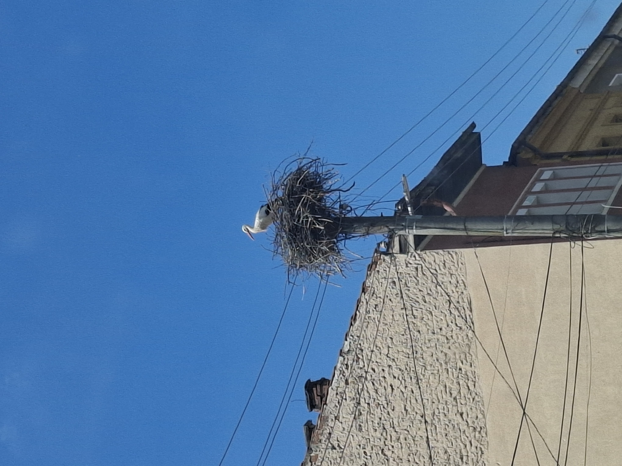 - "A low-angle shot features a stork standing within a large, messy nest constructed on top of a pole attached to a building in Archar, Bulgaria" by FM-A6stU2, licensed under CC BY 4.0