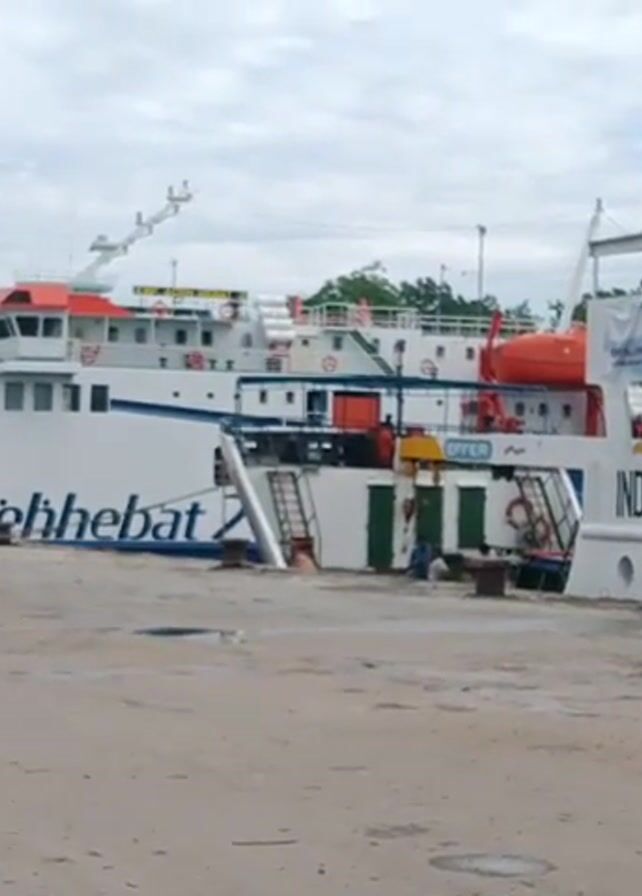 two ships docked at a port. The first ship, painted white with blue lettering, is labeled "aceh hebat" and "KMP ACEH HEBAT 3". A sign with colorful images is next to the ship. The second ship, also white, is labeled "INDONESIAN NAVIGATION SERVICE" and bears the name "AT-417 ANTARES". Ropes connect this ship to the dock. In the background, across the water, are several large industrial buildings, including two white domed structures and a complex of towers and warehouses. The sky is overcast.