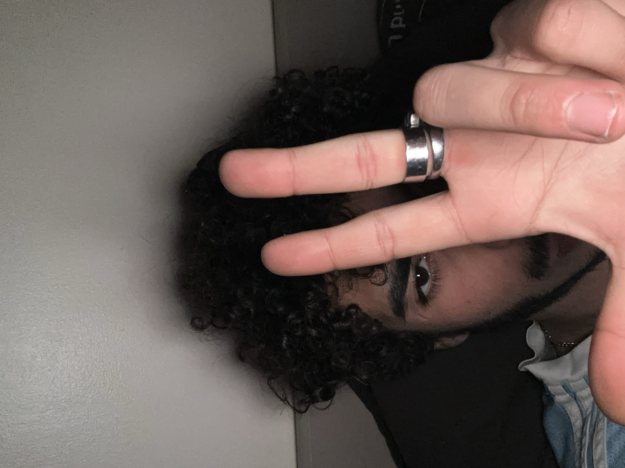 The scene depicts a close-up, indoor portrait of an individual with dark, curly hair and facial stubble. The person's left hand is raised, with the index and middle fingers extended in a V-sign, partially obscuring the lower face. A silver-toned ring is worn on the middle finger. The individual's right eye, dark and partially shadowed, is visible, along with a portion of the right eyebrow. A thin, silver-colored chain is visible around the neck. A light blue and white striped garment is partially visible on the left side of the frame, near the shoulder. The background consists of a light-colored wall or ceiling. Indistinct dark shapes and partial white lettering, possibly 'L pu', are visible in the upper right background. The specific location within Marcoussis, France, is not ascertainable from the visual evidence provided.