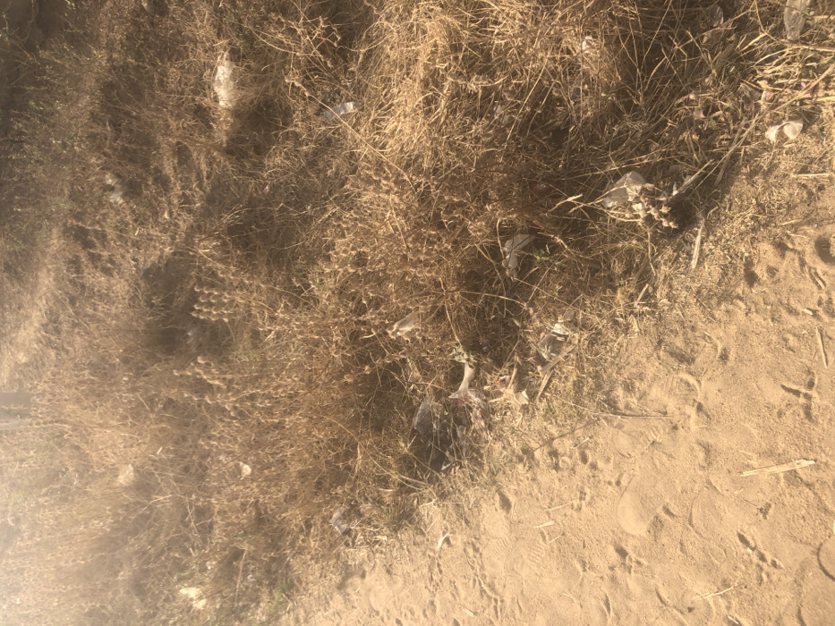 The image depicts a sunlit outdoor scene in Hanwa, Nigeria, characterized by a transition from bare sandy ground to dense, dry vegetation. The lower-left quadrant features light brown-orange sand, showing multiple distinct footprints and depressions, indicative of human passage. The remainder of the frame, covering the right and upper portions, is dominated by dried, golden-brown, and straw-like plant matter. This vegetation varies in texture, with some areas appearing as tangled grasses and others displaying upright stems with visible seed pods or burrs. Interspersed within this dry foliage and partially on the sandy edge are numerous pieces of discarded white plastic, primarily thin bags or fragments, along with other indistinct dark debris. No individuals or animals are visible; however, the footprints and scattered litter provide evidence of human activity in the area. The lighting suggests direct, bright sunlight.