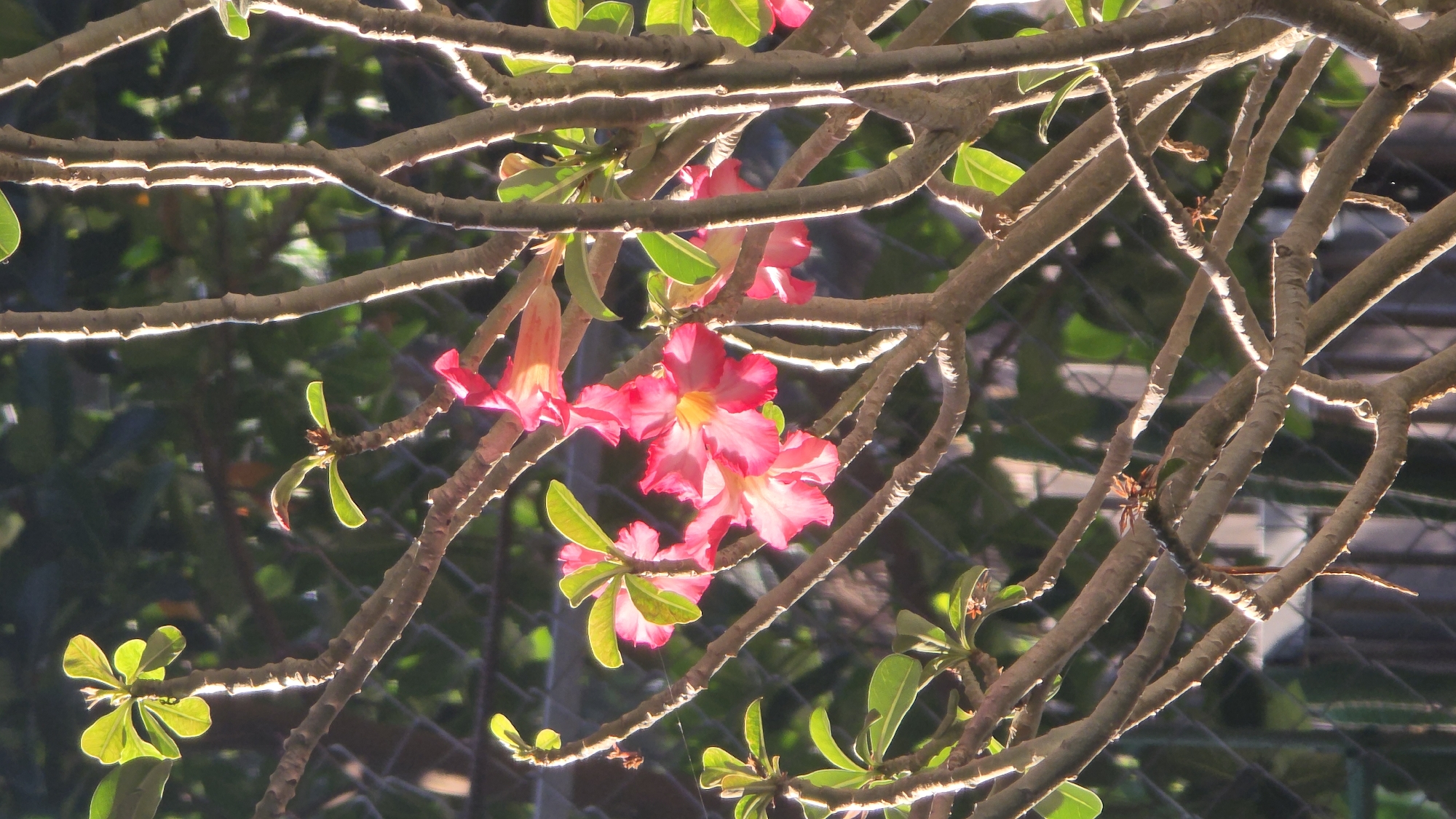 The image captures a Desert Rose (Adenium obesum) plant in an outdoor setting within Nha Trang, Vietnam. The central subject is a cluster of pink flowers, some displaying yellow centers, intermingled with vibrant green leaves at various stages of growth. Numerous bare, light brown branches of the plant extend throughout the frame. Strong backlighting illuminates the edges of the branches and leaves, indicating direct sunlight originating from behind the plant. The background is out of focus, revealing a visible chain-link fence behind the plant, partially obscured by darker green foliage. No individuals, animals, or specific actions are depicted in the scene.