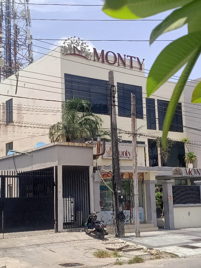 The image displays an urban street scene in Ilado, Nigeria, under a clear, bright sky. A multi-story, light-colored building, identified by prominent red lettering as "MONTY" and an ornate metallic emblem on its upper facade, occupies the central and right portions of the frame. The building features multiple dark, rectangular windows on its upper floors. At street level, below the main sign, a secondary sign reads "Sim...onty Cuisine gelati pizza." The ground floor includes a main entrance with a gray canopy and columns, as well as a separate gated area to the left featuring a large black metal gate, a smaller gate, and a low concrete structure topped with a blue satellite dish. An exposed metal exhaust pipe extends from the building above the gated section. Green foliage, resembling palm plants, is visible on building ledges and near entrances. In the foreground, a paved surface exhibits cracks and sporadic patches of grass. A black scooter with a green front accent is parked on this surface, adjacent to two wooden utility poles heavily entwined with numerous black wires that traverse the scene horizontally. A large, metallic antenna tower is visible in the upper left background, behind the primary building. No individuals are present. Out-of-focus green leaves appear in the immediate upper right foreground.