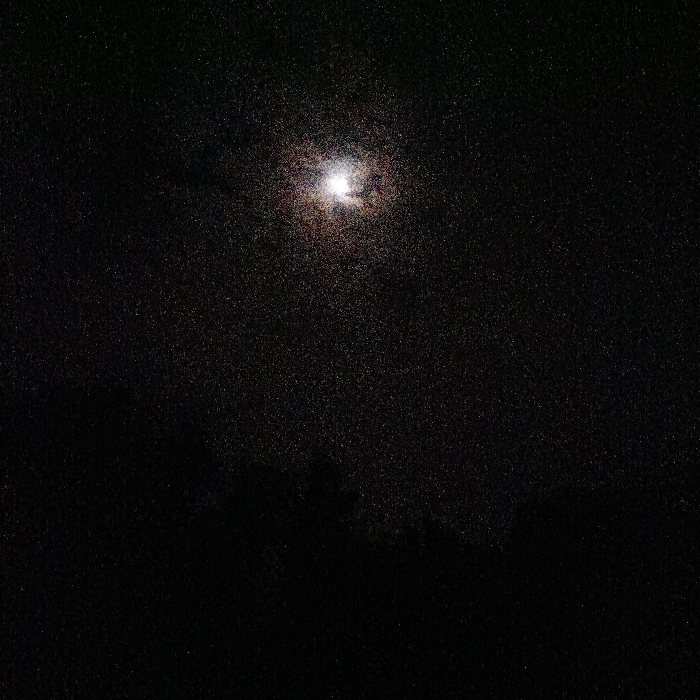 The image displays a dark, nighttime outdoor scene located in Mururi, Kenya. A bright, diffused light source, indicative of the moon, is centered in the upper portion of the frame. The entire field of view is permeated by a high density of small, bright, scattered points. Along the lower horizon, indistinct, dark, amorphous shapes suggest the presence of terrain or vegetation. No individuals, specific objects, actions, or interactions are visible.