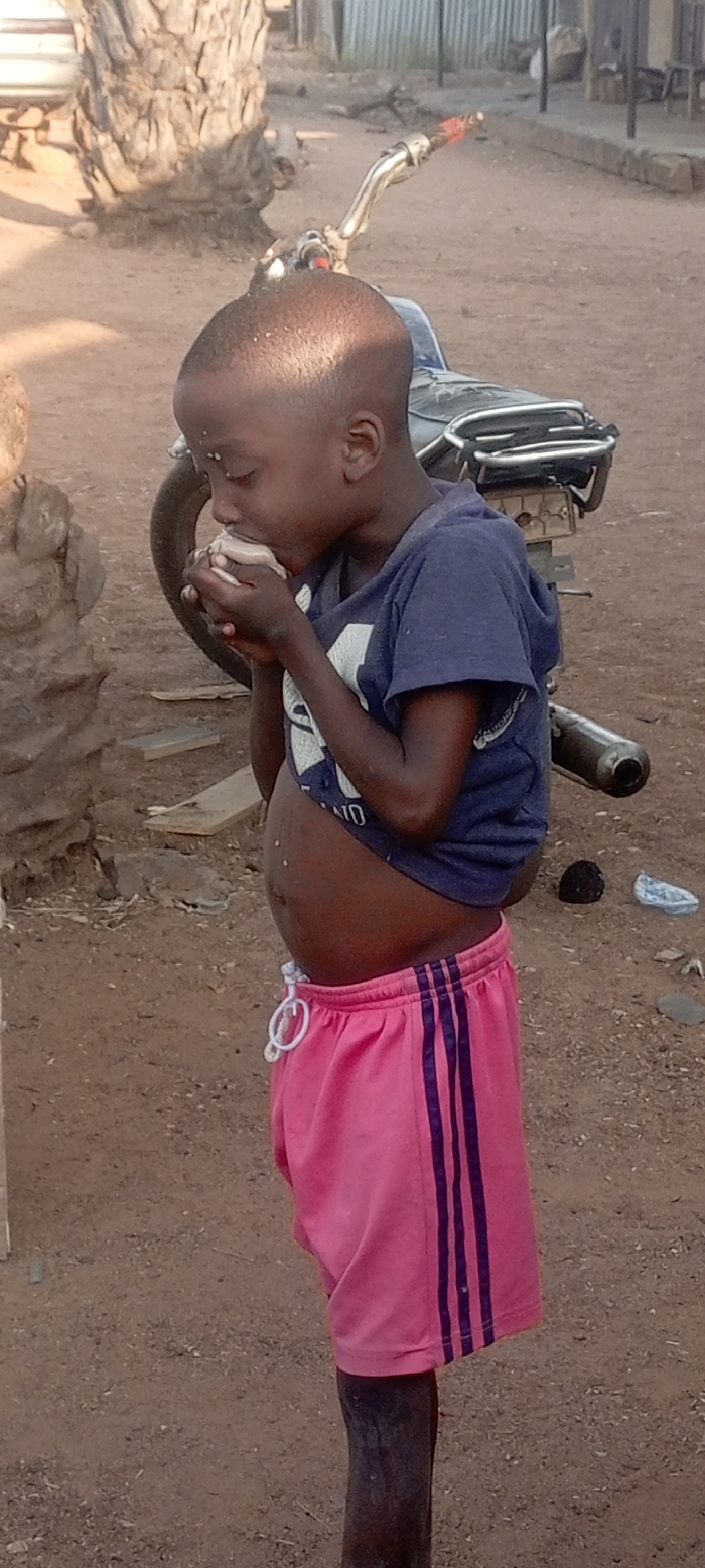 A young boy with a shaved head eats something white from his hands. He wears a blue t-shirt and pink shorts with three purple stripes. His stomach is distended. A motorcycle is behind him. The background appears to be a village scene with trees, a building, and sandy ground.