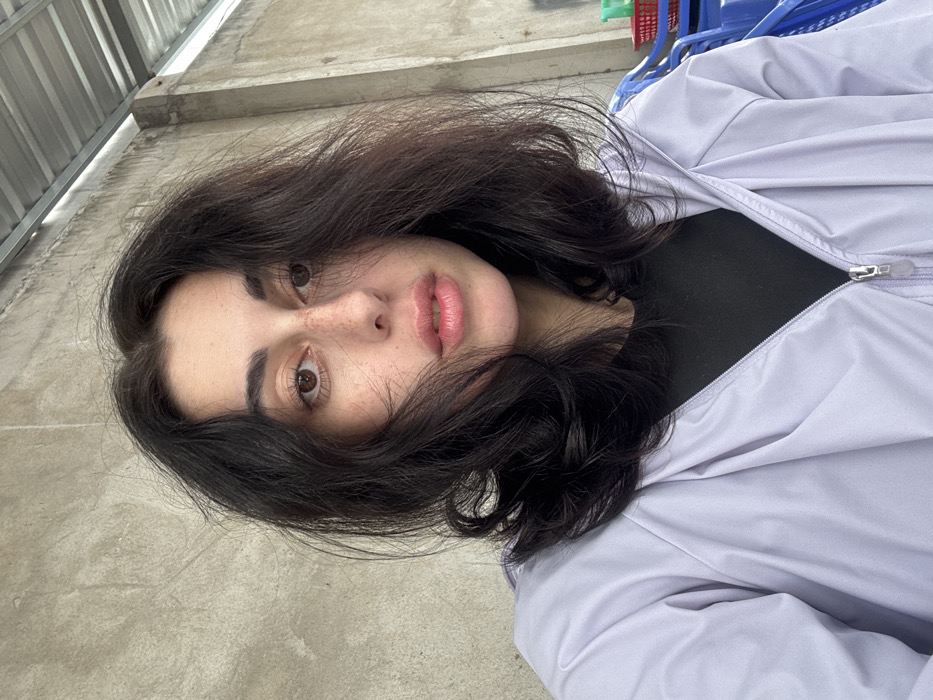 A woman with dark, wavy hair and fair skin poses close to the camera. She has brown eyes and freckles across her nose and cheeks. Her lips are full and pink. She wears a light purple jacket over a black shirt. The background includes a concrete surface and a glimpse of blue plastic chairs stacked on top of each other. The photograph is taken at an angle, with the subject tilting her head towards the camera.