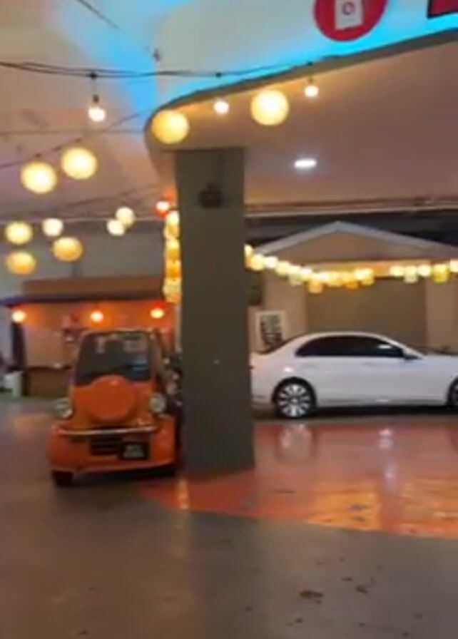 n indoor parking garage decorated with spherical hanging lights. There's a small orange car parked in the foreground to the left. As the camera pans right, we see a white sedan and a light gray minivan with a roof cargo carrier parked in what appears to be a themed gas station set called "JUICY STATION." The gas station has glass walls and a red and white gas pump. A black Cadillac is parked further back, against a white wall, on the right.