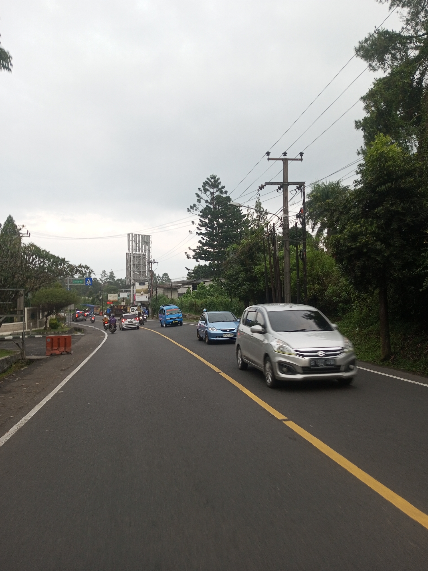 road scene with traffic. A silver car is in the foreground, moving along the right side of the road, with a yellow line marking the lane. A light blue car and a blue minivan are behind it. There are several motorcycles further back in the scene. The road is paved, and there are trees on both sides. Utility poles and wires are visible along the roadside. The sky is overcast. A large metal structure is visible in the distance. The location is not Taunggyi, Myanmar.