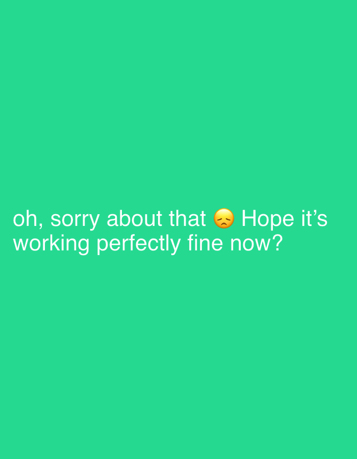 A green screen with the message "oh, sorry about that 🥺 Hope it's working perfectly fine now?" is displayed