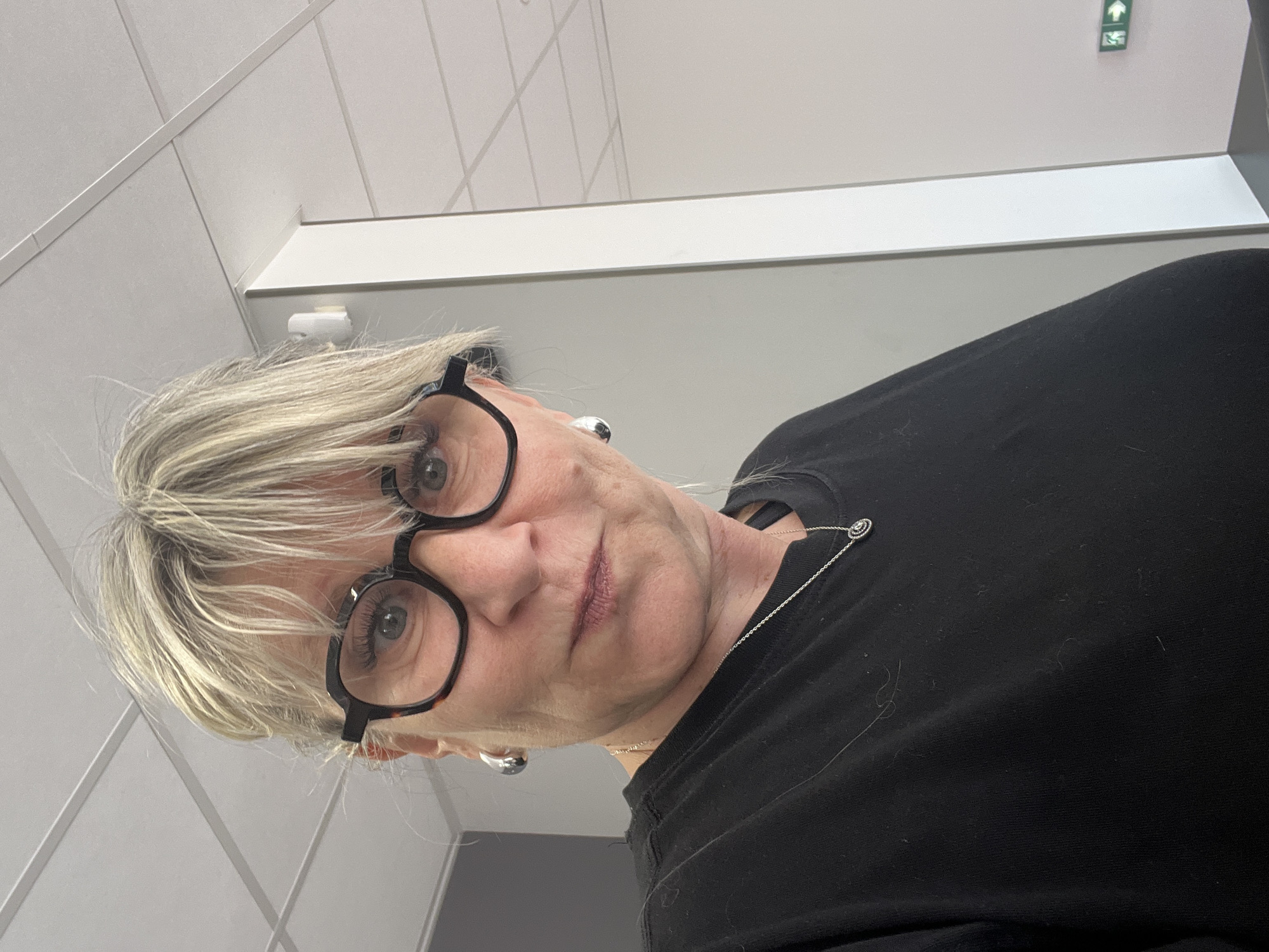 The image presents a close-up, head-and-shoulders view of a middle-aged woman situated indoors in Saint-Galmier, France. The woman has light blonde hair, styled with bangs and exhibiting some graying. She wears dark, possibly tortoise-shell, framed eyeglasses and silver-colored hoop earrings. A silver-colored chain necklace with a circular pendant is visible around her neck. She is dressed in a plain black long-sleeved top or sweater, on which light-colored fibers are present. Her facial expression shows slightly pursed lips and raised eyebrows, as she gazes directly at the viewer. The immediate background features a light-colored suspended ceiling with visible grid lines. To the right, a white vertical architectural element, possibly a column or partition, is evident, with a small white wall-mounted sensor or device above the woman's right shoulder. In the lower right corner, a green emergency exit sign with a white arrow pointing right is affixed to a light-colored wall, situated above a dark, horizontal surface.