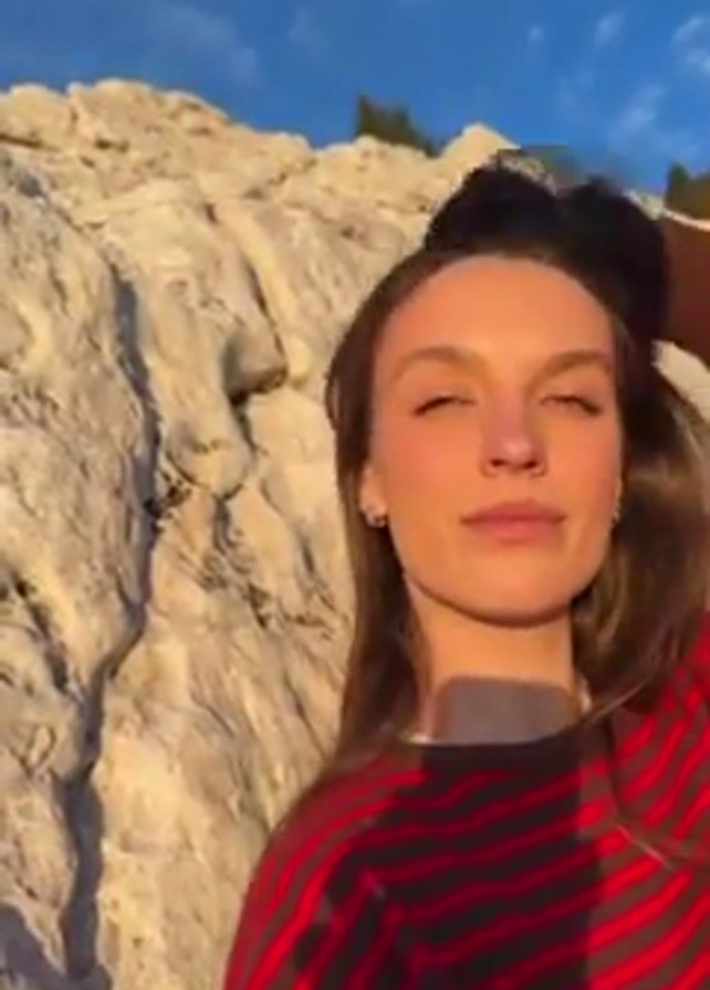 The video features a woman with long brown hair, fair skin, and light eyes, wearing a red and black striped long-sleeved shirt. She is positioned in front of a large, light-colored rock formation, with a clear blue sky visible in the background. The woman is looking towards the camera and touching her hair. The lighting suggests it is either early morning or late afternoon, as the sun casts a warm glow on her face and the rock. There is a slight wind blowing, causing her hair to move.