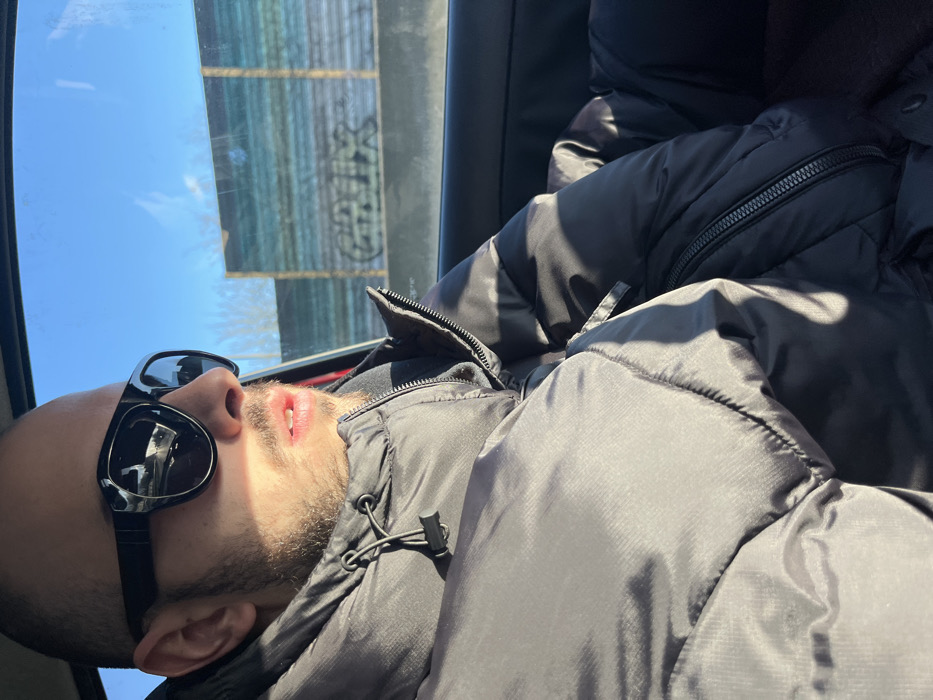 A male individual is depicted from the chest up, seated in the passenger side of a vehicle in Saint-André-lez-Lille, France, under clear daylight conditions. He has short hair, stubble, and wears black sunglasses and a black puffer jacket with a partially visible zipper and a black drawstring toggle. His head is turned towards the right, with his mouth slightly open. Strong sunlight illuminates the left side of his face and jacket, casting shadows. Through the vehicle's window, a clear blue sky is visible above a roadside barrier constructed of horizontal panels, which appear light blue or greenish-blue. Black graffiti spelling "GREX" is present on a lower panel of this barrier. Bare trees are visible in the distance beyond the barrier. The interior of the vehicle shows a red car door frame.