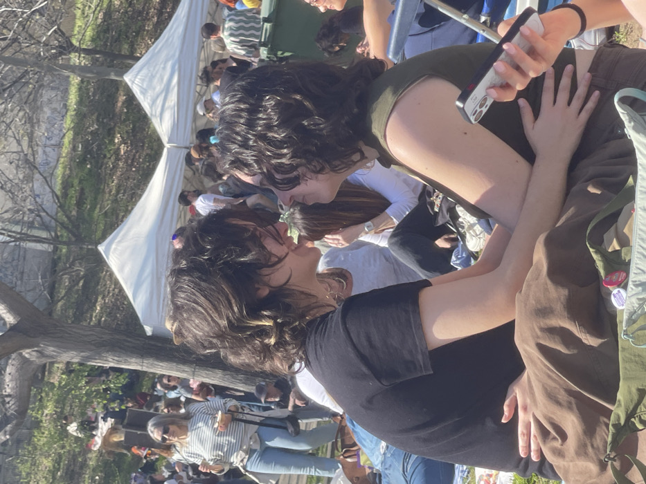 The image depicts an outdoor gathering in Terrassa, Spain, under bright daylight. In the foreground, two individuals are seated on a grassy surface, facing each other with their faces in close proximity. The person on the left has dark, wavy hair, wears a black t-shirt and brown pants; their right hand rests on the other person's lower back. The person on the right has dark, curly hair, wears an olive green sleeveless top and brown pants; their left hand rests on the first person's lower back, and their right hand holds a white smartphone. In the mid-ground and background, numerous other people are present, some standing, others seated on the grass. Two white canopy tents are visible behind the crowd. Trees with bare branches line a sloping grassy hill in the far background. A woman wearing a striped shirt and sunglasses, holding a small bowl, is visible in the left mid-ground. A green waste receptacle is partially visible on the far right.