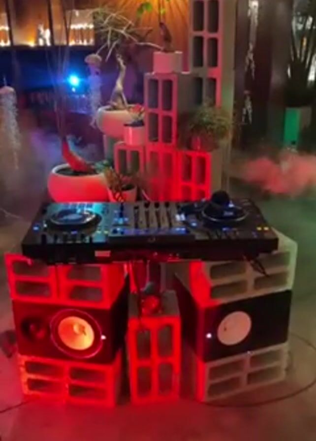 A bar or restaurant setting with a DIY DJ setup in the foreground. The DJ equipment, including a mixer and speakers, is arranged on cinder blocks. Red lights illuminate the setup, and fog effects create a hazy atmosphere. In the background, decorative plants, shelves with glassware, and a unique wall lamp add to the ambiance. A man walks by in the background, holding a bottle.