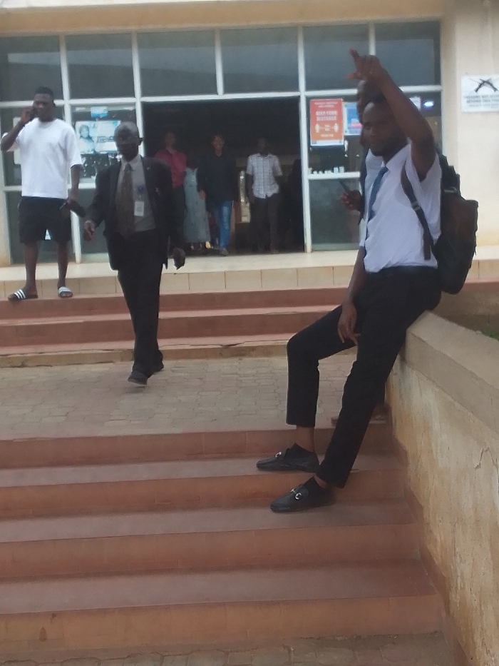 man in a white shirt and black pants sitting on a concrete wall. He is wearing a backpack and has his right hand raised in the air. He is sitting on a concrete wall next to some steps. Behind him, another man in a black suit and black pants is walking down the steps. There is a third man standing to the left of the steps wearing a white t-shirt and black shorts. The scene appears to be in front of a building with glass doors, possibly a school or government building. The image appears to have been taken in Gwarinpa, Nigeria. There is an inscription on the wall in the background that reads "ASSISTANT".