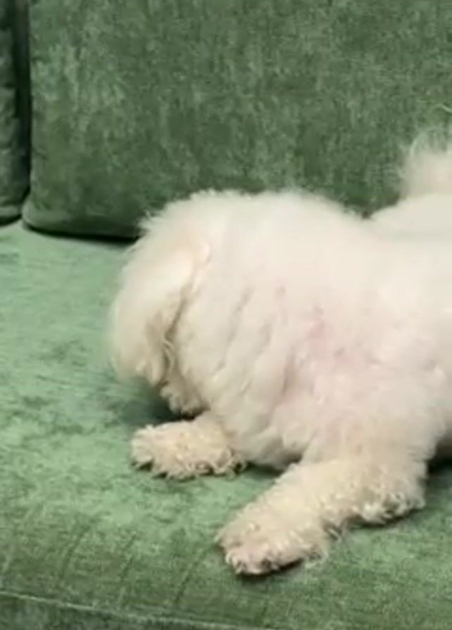A small, white, fluffy dog is lying on a green couch. The dog is facing away from the camera, with its head down and paws resting on the couch cushion. The couch appears to be made of a textured fabric with a subtle striped pattern. The background is out of focus.