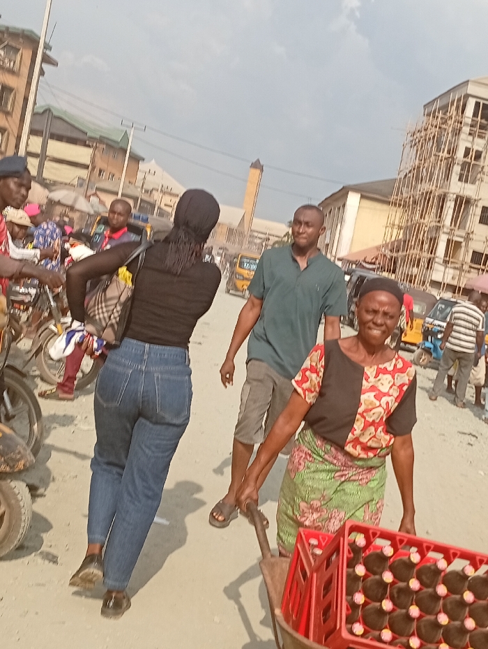 An outdoor scene captures a bustling urban area with a mix of activity. A woman in a green skirt and patterned top pulls a wheelbarrow filled with items, while a man in a green shirt walks beside her. Behind them, a woman with jeans and a black top walks away from the camera. The background shows various people, parked motorcycles, yellow tricycles, and building structures. The sky is overcast, suggesting it may be a crowded marketplace or transportation hub.