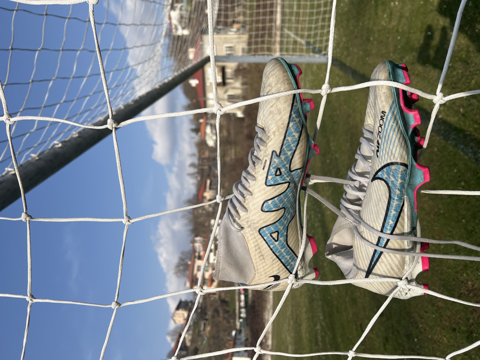 - "A pair of dirty, light-colored Nike football boots is suspended within the white square-mesh netting of a football goal" by FM-yFnm82, licensed under CC BY 4.0