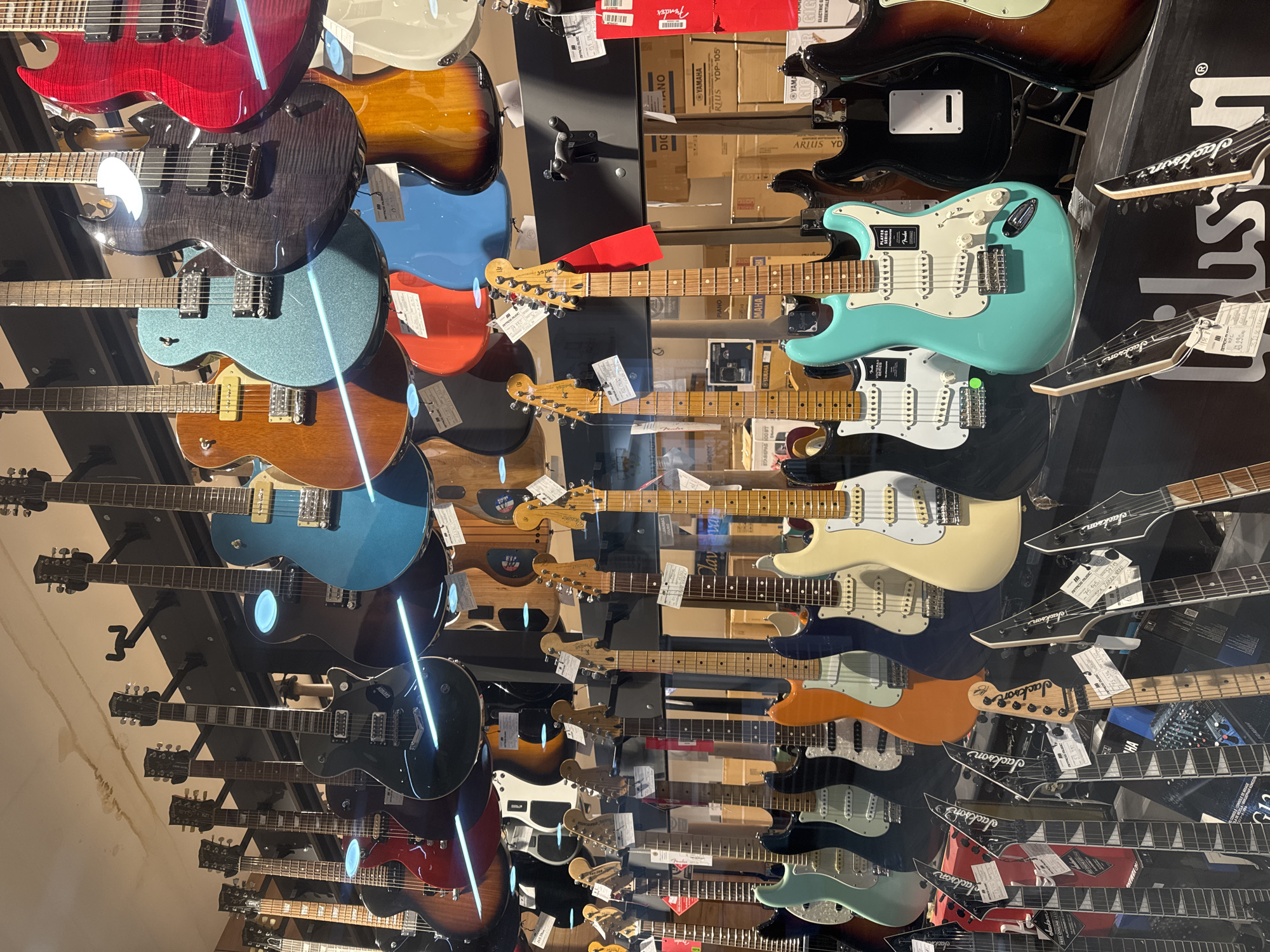 This image captures a dense display of electric guitars within a music retail establishment in Novi Sad, Serbia. Approximately thirty-five electric guitars are visible, arranged vertically in multiple rows. The upper section features guitars hung from black wall mounts, exhibiting a variety of body styles including single-cut, double-cut, and semi-hollow designs, in colors such as metallic blue, deep red, black, dark gray sunburst, natural wood, and teal sparkle finishes. Several of these guitars, including models resembling Gretsch and SG styles, display bright reflections from overhead lighting. The lower rows feature predominantly solid-body electric guitars, many resembling Fender Stratocaster styles with single-coil pickups and tremolo bridges, in colors like light blue, cream, orange, and black, alongside guitars with more angular, aggressive designs typical of Jackson models. Price or information tags are visible on the headstocks and bodies of numerous instruments. The background consists of stacked brown cardboard boxes, some explicitly labeled with "YAMAHA" branding and product codes such as "YDP-105." A large black display item at the bottom foreground features a prominent "Gibson" logo. No individuals are present within the frame.