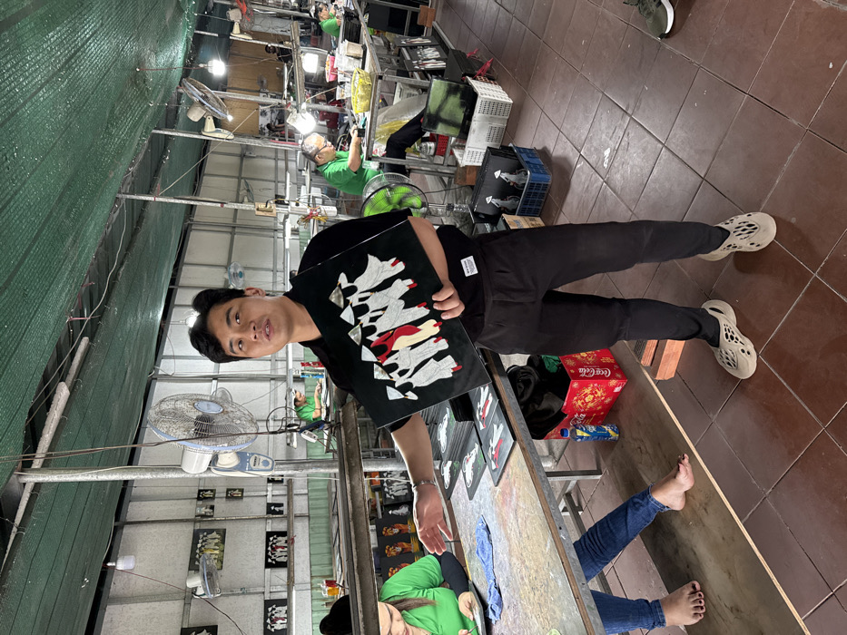 An indoor craft workshop in Ho Chi Minh City, Vietnam, is depicted. A young adult male stands in the foreground, facing the viewer, wearing a black shirt, black pants, and light beige foam clogs. He holds a black rectangular artwork featuring five stylized figures of women in white áo dài and nón lá, with red and yellow accents. His left arm is extended towards the left, palm open. To his left, a person wearing a green shirt and blue jeans sits at a long table, focusing on a piece of artwork; their bare feet, with red-painted toenails, are visible. In the mid-ground and background, multiple individuals, predominantly in green shirts, are seated at similar metal-framed tables, engaged in creating intricate artworks. One older male with glasses and a green shirt is visible working at a workstation. The tables are cluttered with tools, materials, and pieces of artwork, some stacked in white and blue plastic crates. Pedestal fans are mounted or placed throughout the workshop. The floor is covered with brown tiles. The ceiling features exposed beams, electrical wiring, and is partially covered by a green mesh fabric. Illumination is provided by hanging fluorescent tube lights and bare bulbs. A red Coca-Cola crate and a blue water bottle are present on the floor under a table.