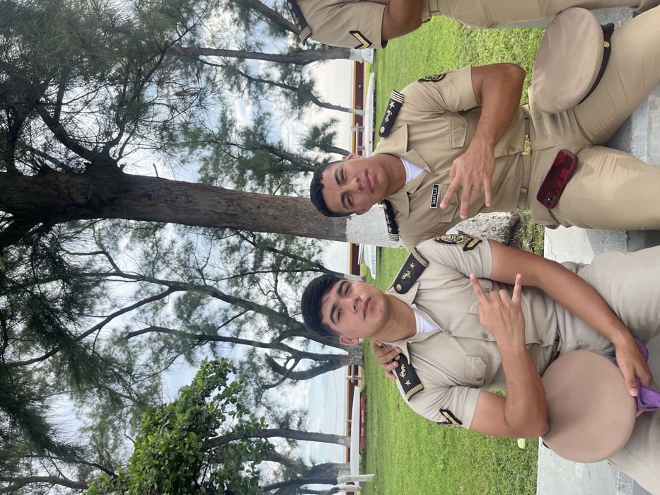 Three young males, uniformed, are seated outdoors on a light-colored concrete surface under an overcast sky. The scene is consistent with a coastal military institution, likely the Heroica Escuela Naval Militar in Antón Lizardo, Veracruz City, Mexico. The individual on the left has dark hair and wears a tan short-sleeved uniform shirt with dark epaulets featuring gold-colored rank insignia (four stars and a bar). His right arm is around the shoulder of the central figure. His left hand forms a "rock on" gesture, and he holds a tan peaked uniform cap with a purple cloth lining. The central individual, with dark hair, wears an identical tan short-sleeved uniform shirt with a "CASTILLO" nametag on the right chest pocket and dark epaulets displaying gold-colored insignia (two anchors and two stripes). His left hand forms a "peace sign." A dark red smartphone in a patterned case rests on his right thigh, and a tan peaked uniform cap lies beside his right thigh on the concrete. A third individual is partially visible on the far right, wearing a similar uniform with gold-colored rank insignia (three stripes) on dark epaulets. The background features a manicured green lawn. Behind the lawn, a white fence with orange-yellow horizontal bands is visible. Several small white boats, one clearly marked "CASTOR," are positioned on the grass. Beyond the fence, a large body of water, identifiable as the Gulf of Mexico, extends to a hazy horizon. Numerous tall, slender trees with sparse green foliage stand against the cloudy sky.