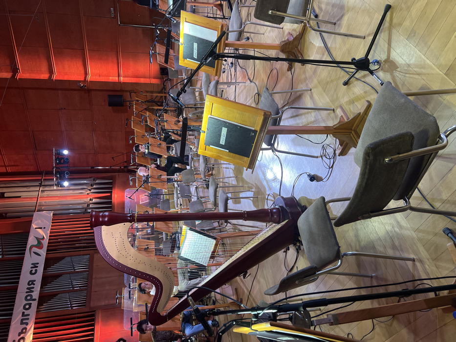 The image displays the interior of a large concert hall, identified as likely the Bulgaria Hall in Sofia, Bulgaria, characterized by its distinctive pipe organ backdrop and warm, theatrical lighting. The stage features a light-colored wooden parquet floor and is illuminated by strong red-orange lighting, highlighting a massive pipe organ with numerous metallic pipes dominating the background. A white banner with the Cyrillic text "България си ти!" (Bulgaria, it's you!) and a colorful graphic is affixed across the upper section of the organ pipes. In the mid-ground, a prominent dark-red wooden pedal harp with numerous strings and a gold-colored soundboard stands on the left. The stage is set with multiple light-brown wooden music stands, several containing black sheet music folders. Gray upholstered chairs with metal frames are arranged around the stands, some occupied and some empty. Clear plexiglass dividers are strategically placed between various musician stations. Several black microphone stands are positioned throughout the setup, and electrical cables are visible on the floor. At least five individuals are present on stage. Two people are seated near the harp on the left; one wears a patterned top, and another person with lighter hair is partially visible behind. Further to the right, three additional musicians are discernible, seated and focused towards their music stands, indicating an active rehearsal or pre-performance setup. The overall scene depicts an orchestral arrangement within a formal performance venue.